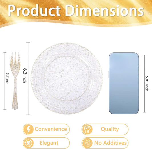 WELLIFE 120-Count Gold Glitter Plastic Dessert Plates and Forks Set, 6.5-Inch Disposable Plates and Durable Small Forks for Catering, Parties, and Weddings
