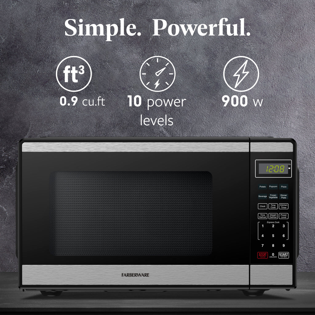 Farberware 0.9 Cu. Ft. Black and Stainless Steel Countertop Microwave with 900W Power, Child Safety Lock, Auto Cook Menu Options, and Defrost Settings