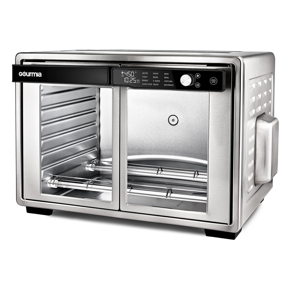 The Gourmia 1700W 9 Slice Digital Toaster Oven and Air Fryer offers family sized capacity with a versatile design capable of air frying, baking, broiling, roasting, toasting, dehydrating, and more. Its spacious 35 liter interior accommodates a 13 inch pizza, nine slices of bread, or a whole chicken, supported by six adjustable rack positions for multi level cooking. The digital interface and large display allow precise control of temperature and cooking time, while the single pull French doors make it easy to load and remove food.