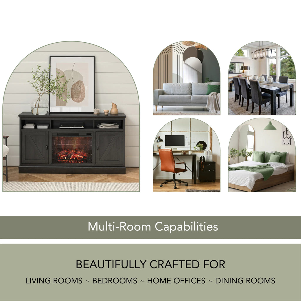 Transform your living space with the Ameriwood Home Ashton Lane Electric Fireplace TV Stand, a sophisticated entertainment solution that merges style with functionality. This console accommodates flat-panel TVs up to 65 inches while housing a remote-controlled 23″ electric fireplace insert that delivers realistic flame visuals and zone heating up to 400 square feet. Toggle between warmth settings (72–82°F) or enjoy the ambiance-only mode with adjustable brightness. The durable LED system operates up to 50,000 hours, while dual side cabinets with four concealed shelves and an open divided shelf provide ample storage for media components and gaming devices. Dual-control operation via remote or touchpad display offers convenience, and the cool-to-touch front ensures safety around children and pets. Finished in black oak, this 58″ W × 15.75″ D × 31.125″ H unit arrives flat-packed and requires assembly.