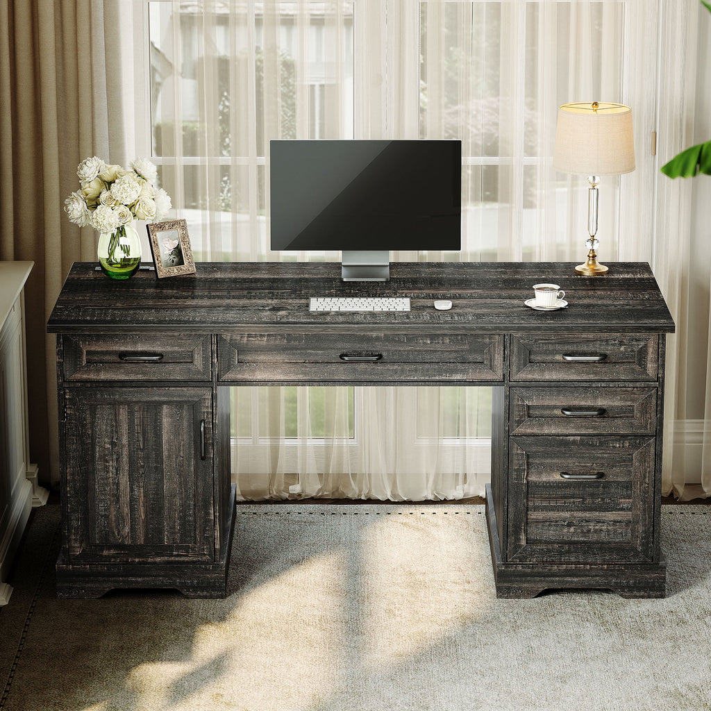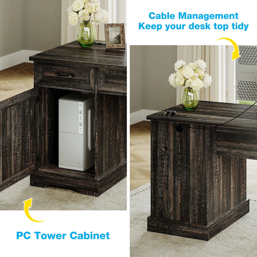 Upgrade your home office with this 59-inch executive desk designed for function and style. The wide desktop easily fits your laptop, monitor, books, and décor, while the built-in power outlet with USB ports keeps your devices charged and ready. With five drawers and a side file cabinet, everything from pens to paperwork stays neatly organized. A closed-door cabinet on the side offers a safe, dust-free home for your CPU or large electronics. This desk is perfect for remote work, studying, or managing daily tasks—all in one organized space. Its modern look blends easily with any home setup, and clear instructions ensure a smooth assembly experience.