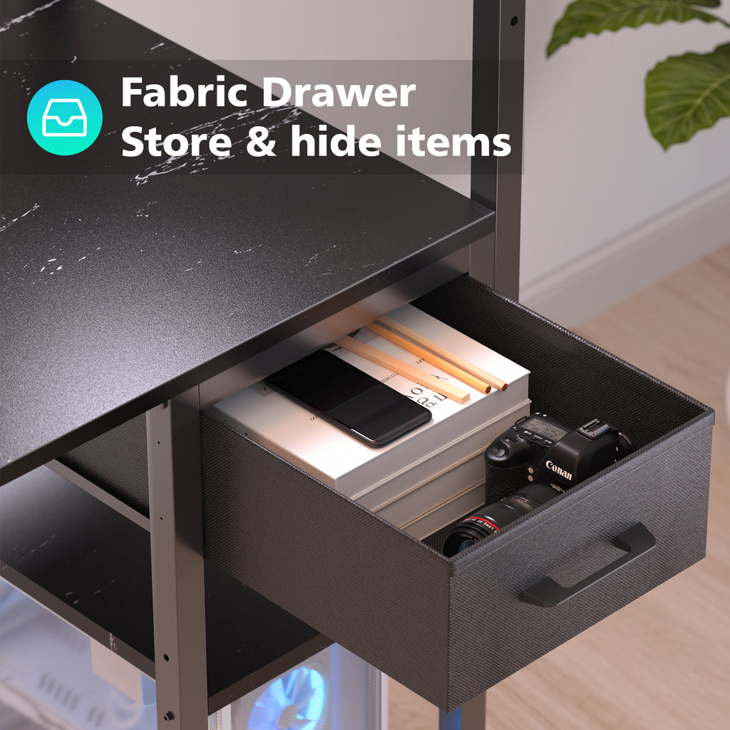 Organized Layout: Keep your area tidy with a Fabric drawer, 4 shelves and storage bag, perfect for a productive gaming or working session.
