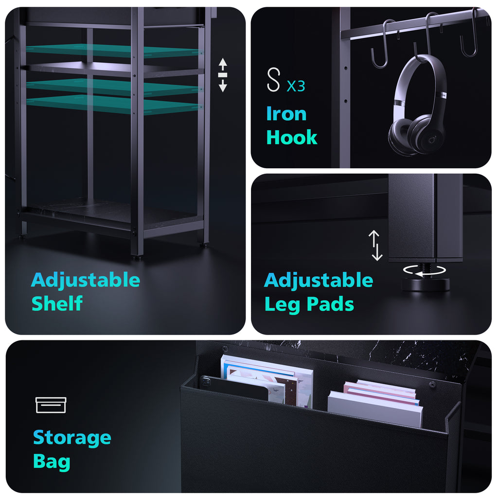 Adjustable Shelves: Equipped with adjustable shelves, this corner desk provides four different height options for ample storage space to store books, plants, gaming gear, and more. The open structure design also ensures generous legroom, creating a comfortable workspace.