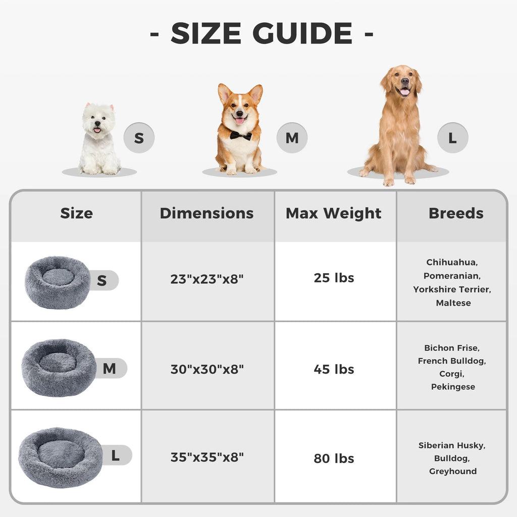 PAWZ Road Calming Donut Dog Bed Anti-Anxiety Plush Pillow Self-Warming Puppy Cat Bed Ideal for Small, Medium and Large Pets PAWZ Road pet beds - the ultimate combination of design, comfort, and durability. With the circular donut design and premium PP material, our round plush pet beds are truly remarkable. Perfect for furry kittens and puppies, our pet beds provide a sense of security with raised edges and cozy, warm nests.These beds are suitable for both indoor and outdoor use and are available in three sizes: 23", 35", and 45", catering to pets weighing up to 25lbs, 45lbs, and 100 lbs respectively. They're designed to be versatile, providing stability and comfort wherever you place them - whether it's on your home floor or in your car seat. Your pet will feel safe and calm with their familiar cozy touch. PAWZ Road Pet beds are machine washable and easy to maintain. After washing, simply sun the bed to restore its original fluffy, plush texture, thanks to the resilient PP material.