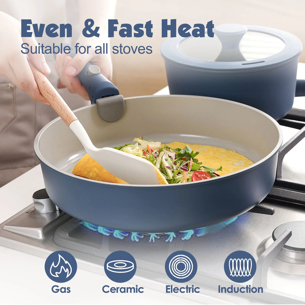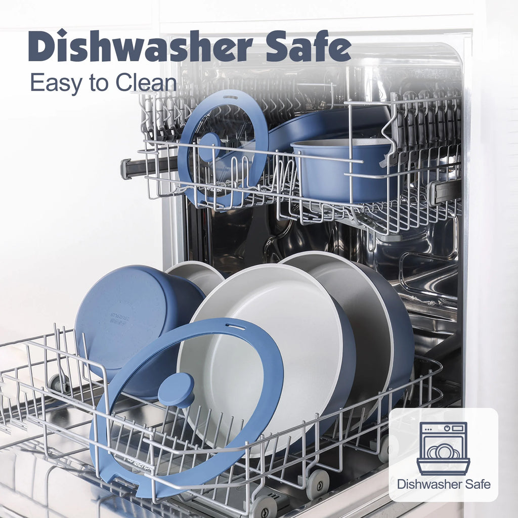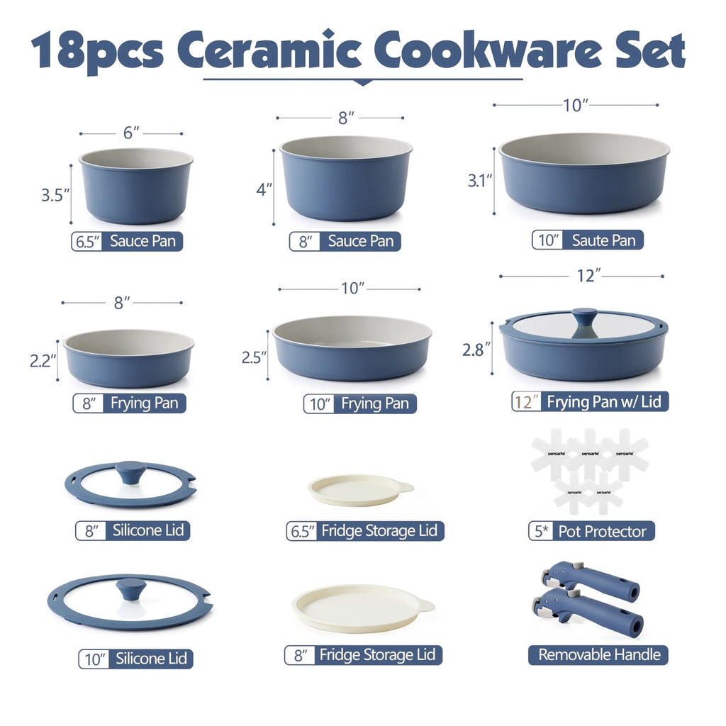 - This 18Pcs Ceramic Cookware Set includes: 2Qt Sauce Pan, 3Qt Sauce Pan with Lid, 8" Frying Pan, 10" Frying Pan, 12" Frying Pan with Lid, 10" Saute Pan with Lid, 6.5" Fridge Storage Lid, 8" Fridge Storage Lid, 2x Removable Handles, 5x Pan Protectors