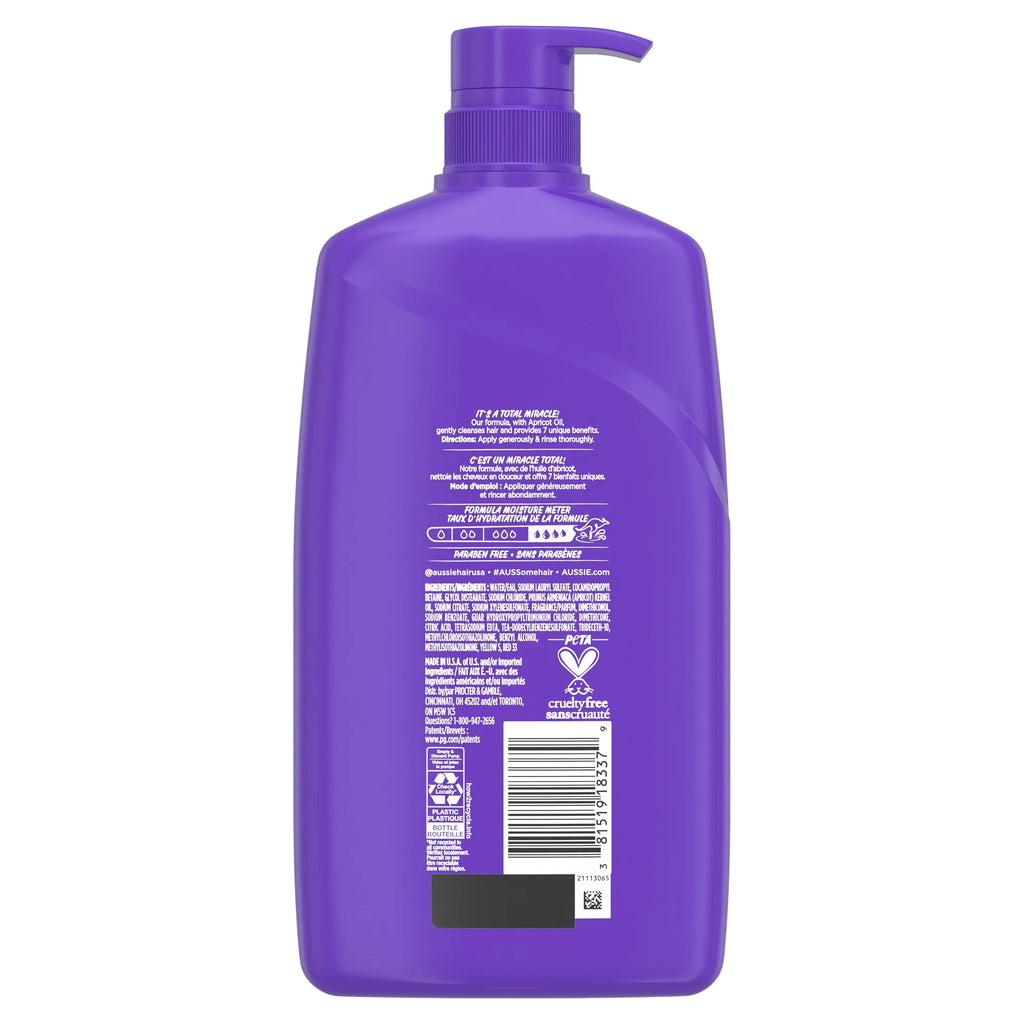 Aussie Total Miracle Shampoo 26.2 oz delivers seven essential benefits in one paraben-free formula suitable for all hair types. Infused with apricot and Australian macadamia oil, it helps strengthen hair, improve softness, enhance shine, support moisture retention, reduce the look of split ends, smooth the cuticle, and provide humidity control. This shampoo gently cleanses without stripping natural oils, making it ideal for daily use and especially effective for dry or damaged hair.